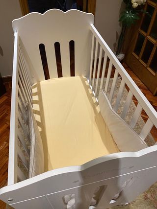 Cama cuna convertible de alta calidad. Cuna con cambiador, barrera movil y cajones almacenaje con antigolpeo. Cuando el niño crezca se convierte en cama con tres cajones inferiores, mesa escritorio, cajornera y mesita de noche. Madera gruesa y pesada, de muy buena calidad. Precio nueva 1.200 €