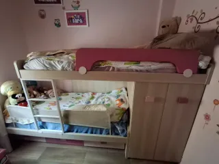 Cama doble infantil con cajones, ideal para habitaciones de niños. La cama de abajo nunca se ha llegado a utilizar. Medidas sin colchón : 202cm x 102cm x 72cm Admite un colchónes hasta de 100x200 - Estructura de madera clara. -Diseño robusto - 4 Cajones de diferentes colores. - 1 Colchón incluido. Se entrega desmontado con su tornillería incluida. Se recoje en Triana.