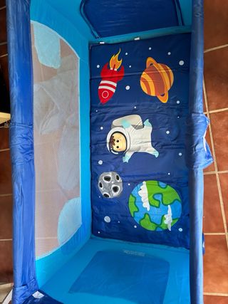 Parque cuna de la marca Asalvo Baby con un divertido diseño espacial. - Estructura de color azul y turquesa. - Ilustraciones de planetas, cohetes y astronautas. - Malla transpirable en los laterales.