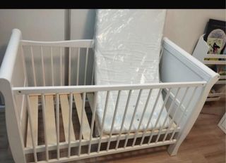 Cuna blanca de madera, ideal para habitaciones infantiles. Su diseño clásico se adapta a cualquier estilo de decoración. - Estructura de madera resistente. - Barreras de seguridad. - Colchón incluido.