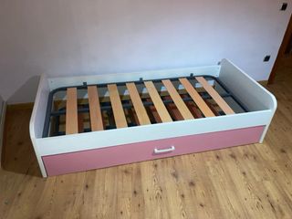 Cama nido infantil con un diseño moderno y funcional, ideal para habitaciones de niños. - Estructura blanca y rosa. - Somier de láminas de madera. - Incluye un colchón de 90 cm.
