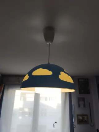 Lámpara colgante infantil de IKEA con un divertido diseño de nubes. - Forma de hongo. - Color azul con nubes amarillas. - Ideal para habitaciones infantiles.