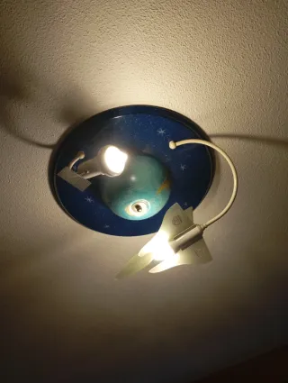 Bonita lámpara infantil con temática espacial, en buen estado. - Diseño con globo terráqueo y nave espacial. - Base redonda azul con estrellas.