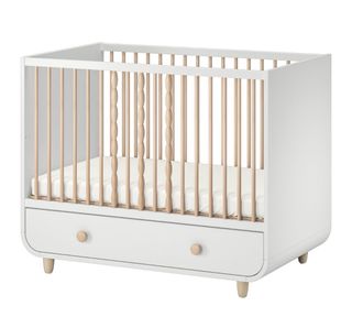 Cuna de bebé modelo Myllra de Ikea en color blanco. Cuenta con un práctico cajón inferior. Medidas: 60x120 cm - Diseño moderno y funcional. - Barras de madera claras. - Cajón muy amplio con dos tiradores redondos de madera. - Fácil de montar y resistente.