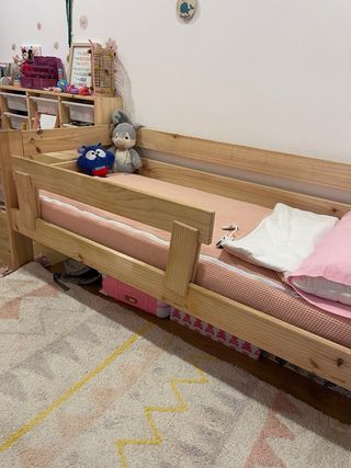 Cama infantil extensible de color blanco, ideal para adaptarse al crecimiento. Modelo Slack de Ikea. - Estructura de madera. - Somier de láminas de madera. - Cabecero rosa. Tiene algunas marcas de uso como se ve en la fotos. Unda de ellas es una rayada en el cabecero, pero queda en parte que normalmente da a la pared con lo que no se vería. Regalo bajeras de la versión más pequeña y la versión mediana. No incluye colchón Se entrega desmontada.