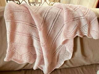Manta tejida a mano en color rosa, ideal para bebés. Su diseño delicado la hace perfecta para abrigar. - Tejido de punto con detalles calados. - Borde ondulado.