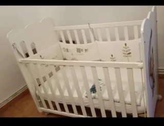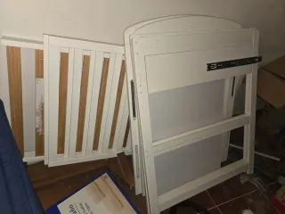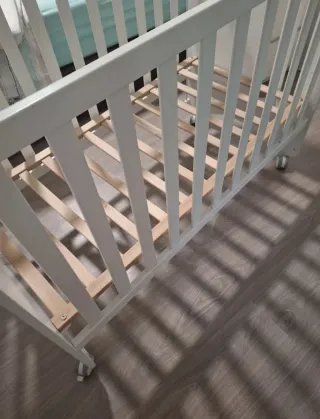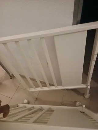 Cuna de madera en color blanco con dos posiciones de somier. Incluye colchón. - Tiene dos posiciones ajustables, va sin ruedas porque se me rompíeron, pero las tengo. La barrera es ajustable, sube y baja. - Juego de sábanas con estampado de robots aparte, 15€ .