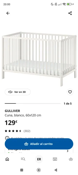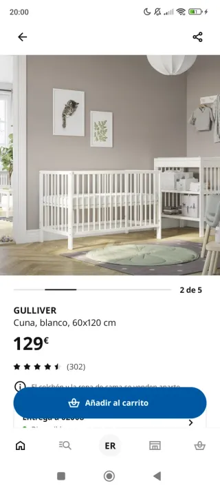 Cuna de bebé de la marca Ikea, en color blanco. - Diseño clásico y elegante. - Barandillas de seguridad. - Base ajustable en altura. El colchón se puede poner en dos alturas diferentes. Tiene un pequeño arañazo, al poner el colchón no sería visible. Envío desmontada En persona solo en Albacete