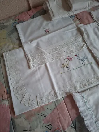 Conjunto de sábanas para cuna con bonitos bordados. Se pueden vender por separado 5€ /una - Se incluye sábana bajera. - Diseños infantiles - Algodón blanco
