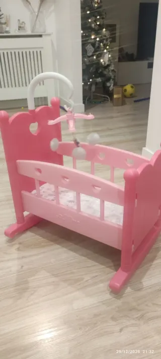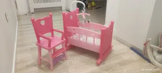 Conjunto de cuna y trona de juguete en color rosa, ideal para muñecas. - Cuna con móvil. - Trona con asiento y respaldo.