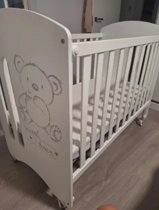 Cuna de bebé en color blanco, con un tierno diseño de osito. - Dibujo de sweet bear en el lateral. - Estructura de madera. - Ruedas para facilitar el movimiento.