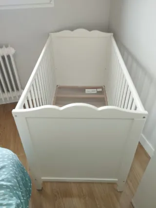 Cuna modelo Hensvik de IKEA en color blanco. Incluye el somier. Se puede colocar el colchón en dos alturas diferentes. Estructura de madera. Tiene un pequeño arañazo en una esquina por la parte interna que puede tapar el colchón. Se entrega desmontada. Solo para recoger en Albacete.