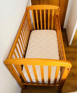 Cuna de madera con colchón incluido. Ideal para el descanso del bebé. - Estructura de madera clara. - Colchón. - Móvil de cuna con figuras. *Mi hijo durmió en ella 5 veces contada, así que la queremos quitar.