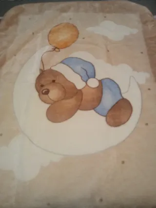 Manta muy suave para cuna con un tierno diseño. - Dibujo de oso durmiendo en la luna. - Tonos pastel, unisex.