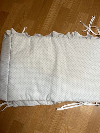 Protector acolchado para cuna con un diseño de lunares grises sobre fondo blanco. Cuenta con cintas para su sujeción. - Tejido exterior de algodón. - Relleno interior de fibra de poliéster. - Cintas de sujeción en la parte superior e inferior.