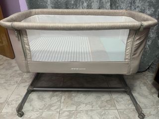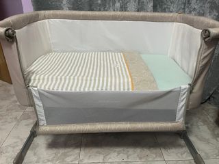 Cuna de colecho de la marca Bebeconfort en color gris. Ideal para tener al bebé cerca durante la noche. Muy poco uso. - Laterales de malla transpirable. - Colchón incluido. - Estructura metálica. - Altura ajustable.