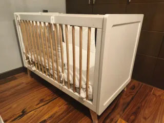 Cuna de bebé. Diseño moderno y funcional. - si te interesa el colchón está por 30€ más. Es de marca Lémur y está súper bien cuidado. - Estructura de madera blanca. - Laterales con barrotes de madera natural. - Patas de madera - Regalo los protectores del cabecero. - tiene dos alturas