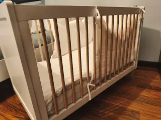 Cuna blanca para bebé, modelo Gulliver Ikea. Tiene los cuatro lados. 120x60cm. - Estructura de madera lacada en blanco. - 2 alturas. - Barreras de seguridad. - Ruedas añadidas para facilitar su movilidad. ✅Se incluyen juegos de sábana sin apenas uso. ✅Se incluye colchón marca Eccus. 👉🏼opcional: nórdico fino sin estrenar 🪛Con algunos arañazos por el montaje que se ven en fotos. La cuna, salvo por los pequeños arañazos por el montaje, está en perfecto estado, apenas se ha usado. 💶El precio es por todo.