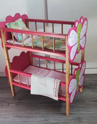 Cuna litera para muñecos con un diseño encantador. - Estructura de madera. - Decoración de mariposas en los laterales. - Incluye colchones y ropa de cama. El contrachapado de la cama baja está partido, pero con la cinta adhesiva queda solucionado y no afecta al juego. Una de las patas tiene un defecto que se aprecia en la imagen, pero tampoco afecta al juego. Además tengo la trona a juego. Pack completo 30€