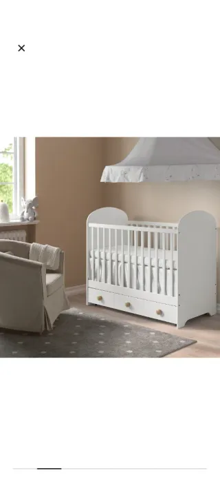 *Precio original 259€ Cuna de Ikea con dos alturas que se puede transformar en una camita. Incluye cajón para almacenamiento. - Medidas: 128 cm (largo) x 107 cm (alto) x 66 cm (ancho). - Altura del cajón: 52 cm. - Altura de la base de la cama: 28 cm. Faltan dos tornillos hembra y tiene algunas mariquitas pequeñas.