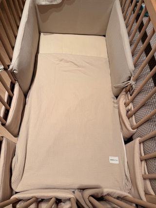 Cuna colecho de la marca Jané, ideal para tener al bebé cerca durante la noche. Su diseño permite acoplarla fácilmente a la cama. - Estructura de madera y textil. - Interior con estampado de estrellas doradas. - Colchón incluido. - Recogida en Badalona