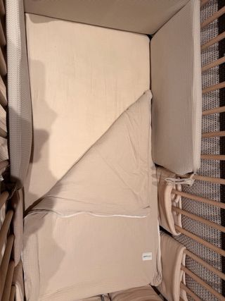 Saco-cuna de la marca Minicoton en color beige. - Tejido exterior de algodón. - Interior suave y transpirable. - Cierre con cremallera. Pequeña mini mancha ultima foto