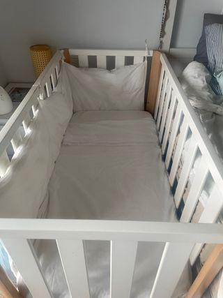 Cuna infantil en perfecto estado, lista para usar. - Incluye funda nórdica con relleno de cuna a cuadros grises y blancos de Minicoton. -incluye colchón - Incluye protector de colchón. - incluye protectores cuna Minicoton. -incluye cambiador con funda Minicoton. -cuna montada i equipada por valor de 500€.
