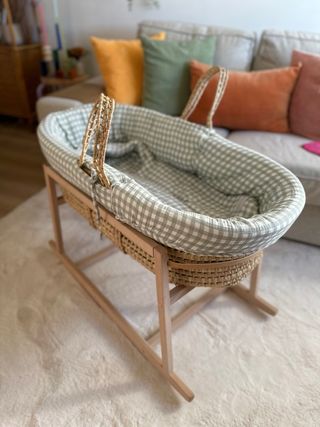 Se vende moisés de bebé de mimbre natural con estructura de madera y colchón acolchado. Incluye saco, cubierta y sábana bajera de la marca Mini Cottons, de alta calidad y en muy buen estado. Está muy bien cuidado, limpio y listo para usar. Ideal para los primeros meses del bebé: cómodo, ligero y fácil de mover, pero a la vez estable y resistente. Su diseño natural encaja perfectamente en cualquier tipo de hogar. Incluye: • Moisés de mimbre • Soporte de madera • Colchón • Saco Mini Cotton • Cubierta Mini Cotton • Sábana bajera Mini Cotton Hogar libre de humos y mascotas.