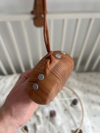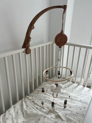 Móvil musical de madera para cuna, con un diseño encantador y materiales naturales. - Soporte de (madera y plástico) para colgar en la cuna. - Elementos decorativos de fieltro y madera. - Incluye una caja que gira y reproduce música de nanas.