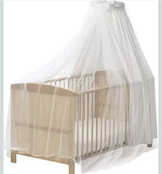 Mosquitera de tul blanco para cuna. Protege al bebé de insectos y crea un ambiente acogedor. - Material: Tul ligero y transpirable. - Color: Blanco. - Diseño: Confección con volantes en la parte superior.