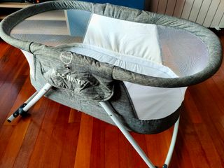 Cuna portátil de color gris. Cuenta con laterales de malla transpirable y un diseño moderno. - Dimensiones: 80l. x 42an. x 86al. cm. - Recomendación peso máximo: 10 kg - Fácil apertura de la cuna para acceder al bebé. - Laterales de malla para ventilación. - Estructura plegable. - Posición inclinada anti-reflujo. También útil para cuando están con muchos mocos. - Altura ajustable, 5 posiciones de 74 cm a 86 cm. - Colchón de 4 cm de grosor. - Patas retráctiles con frenos de rodillo. Se puede poner pegado a la cama o se puede utilizar como cuna de viaje. Esta equipada con una bolsa de transporte y el montaje es rápido y fácil.