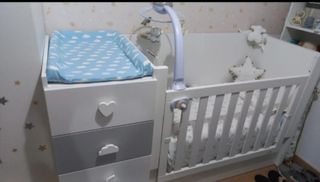 Cuna convertible para bebé, en muy buen estado y apenas usada. No envío - Diseño moderno y funcional. - Acabado blanco y gris. - Cajones con tiradores en forma de corazón y nube.