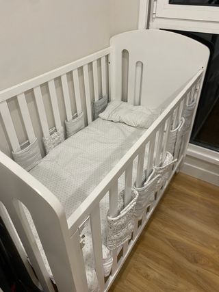 Cuna colecho de la marca Don Algodón, ideal para tener al bebé cerca. - Diseño en color blanco. - Incluye protector de barrotes. - Ropa de cama a juego con diferentes estampados - relleno nórdico con funda y almohada - colchón reversible para verano y invierno viscolastico y antiafixia en buen estado ya que apenas a dormido y funda protectora de colchón de rizo