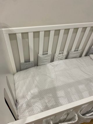 Cuna de madera Ikea. Incluyo colchón (está casi sin usar ya que apenas ha dormido en la cuna) y cojín Lovenest de Babymoov. También el protector de colchón + dos sábanas + almacenaje colgante LEN + mantita 70x90 cm. (todo de Ikea). Doudou Chicco camaleón y sujeta móvil de cuna de madera. La cuna está en perfecto estado, tiene dos posiciones (altura más baja o más alta). Todo lo demás está prácticamente nuevo.