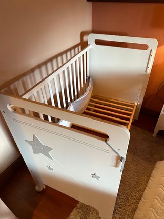 Se vende maxi cuna convertible en cama. Medidas 140x90, colchon 130x80. En buen estado, solo un pequeño rasguño en uno de los soportes laterales. Se bajan ambas barreras o se pueden quitar para su conversión en cama. Tiene un hueco bajo el somier donde se pueden dejar cosas. Colchón en buen estado incluido. Imprescindible pasar a recoger (Amorebieta) Se urge vender.