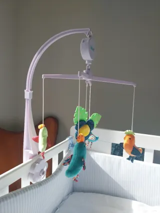 Ideal para el descanso de tu bebé! Vendo móvil de cuna Chicco Next2Dreams en color rosa, diseñado especialmente para cunas de colecho (compatible con Chicco Next2Me) y también para cunas de madera. Características principales: 3 en 1: Móvil con peluches, proyector de luz suave y panel musical extraíble. Música relajante: 20 minutos de música clásica (Chopin, Schumann, Offenbach) y ruido blanco para calmar al bebé. Luz nocturna: Panel con forma de luna que emite una luz tenue. Versatilidad: La caja musical se puede quitar y enganchar fácilmente en el cochecito o la silla de paseo.