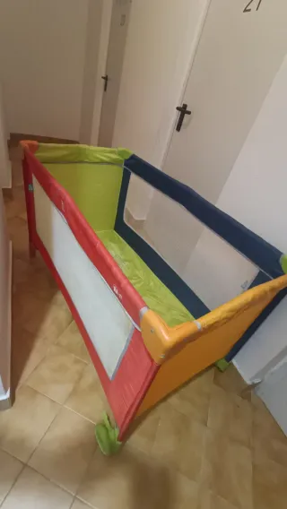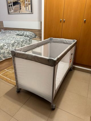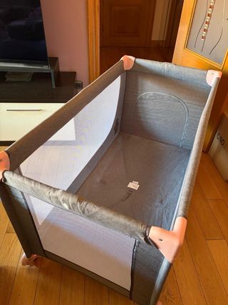 Cuna de viaje desmontable de la marca Plastimyr. Es fácil de montar y desmontar. Las fundas están algo amarillas por el uso pero está bien conservada. - Diseño moderno y funcional. - Laterales de malla transpirable. - Estructura resistente.