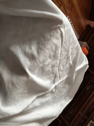 Preciosa sábana antigua para cuna, con un delicado bordado y borde festoneado. - Tejido blanco de algodón. - Detalle de bordado en la parte superior. - Borde con ondas y pequeños círculos.