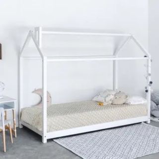 Cama infantil con diseño de casita, inspirada en el método Montessori. Fabricada en madera y pintada en blanco. - Estructura de madera. - Acabado en color blanco.