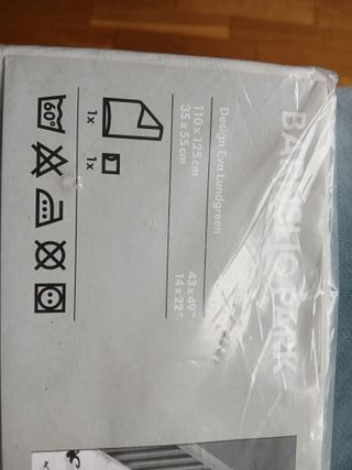 Sabana para cuna de IKEA, modelo Barnslig Park. Sin usae. Con una mancha amarilla que se ve en fotos - Diseño de Eva Lundgreen. - Medidas: 110 x 125 cm (sábana) y 35 x 55 cm (funda de almohada). - También incluye medidas en pulgadas: 43 x 49 y 14 x 22. - Instrucciones de lavado: lavar a máquina a 60°C, no usar lejía, planchar a temperatura media, no limpiar en seco.