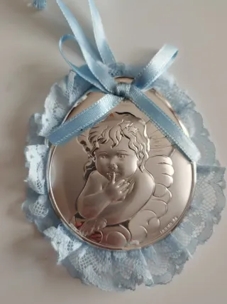 Preciosa medalla de cuna de plata con un diseño de angelitos. Viene con una cinta blanca para colgar. Recomiendo ver etiqueta donde se habla de que ha sido un artículo cuidadosamente lacado y cocido en horno a más de 130 grados. Está en perfecto estado, sin estrenar y con la cajita intacta. - Material: Plata - Diseño: Angelitos - Incluye cinta blanca