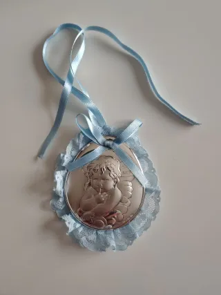 Preciosa medalla de plata con la imagen de un Ángel de la Guarda, ideal para cuna. - Dimensiones: ancho 6 cm. x alto 7 cm. - Diseño en relieve. - Adorno de encaje y lazo azul. - Acabado en plata bilaminada.