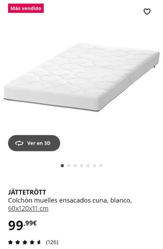 Conjunto de Cuna SNIGLAR de madera y Colchón JATTETROTT de muelles ensacados. SNIGLAR: - Diseño de madera. - Tamaño de 60x120 cm. - Modificada para poder retirar un lateral y que la niña/o pueda entrar y salir sola/o. Entrego la pieza lateral y la tornillería necesaria. - La base de la cuna de puede montar a dos alturas diferentes. - La base de la cuna permite que circule el aire y se cree un entorno agradable toda la noche. JATTETROTT: - La funda se puede quitar fácilmente y se puede lavar a máquina a 40°C. -Los muelles ensacados hacen que el aire circule libremente por el núcleo.