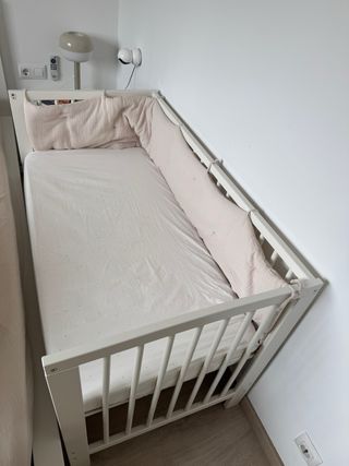 Se vende cuna Gulliver de IKEA junto con su colchón Krummelur, y la chichonera que se ve en las fotos de ZARA. - A la cuna se le puede quitar un lateral para hacer colecho. - El colchón se puede poner a dos alturas. - Colchón incluido. - Ni un mes de uso ya que nuestro bebé decidió dormir en nuestra cama 😅