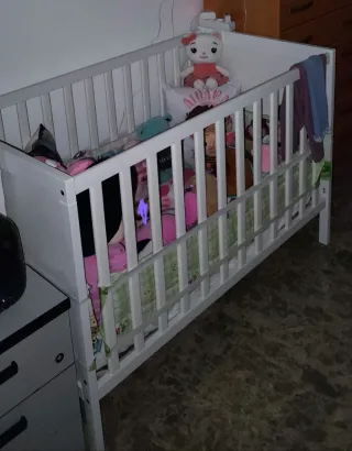Cuna de la marca Ikea en color blanco. Ideal para un dormitorio infantil. Se incluye con colchón, ropita de cama y cojines. También viene incluida la otra barrera protectora que daría cierre a la cuna. Nunca se le ha dado uso por lo que está nueva.