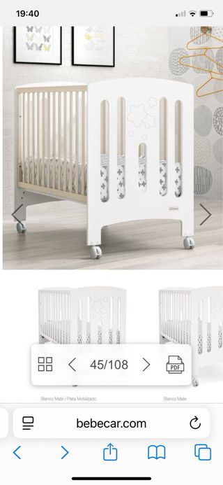 Medidas internas: 120 x 60 cm. 3 posiciones de somier en versión cuna. Lateral abatible. Ruedas giratorias con freno. Material: Madera de pino / Tablero melaminizado. No tengo más fotos porque está guardada desmontada en su caja.