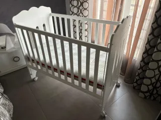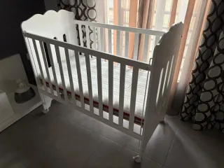 Cuna de la marca Jane con colchón viscoelástico incluido. Ideal para el descanso del bebé. - Cuna de madera blanca. - Ruedas para facilitar el movimiento. - Colchón viscoelástico. - Solo 2 meses de uso