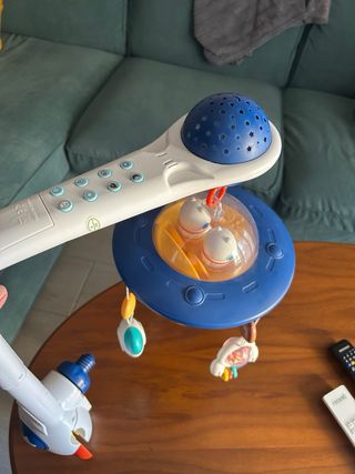Móvil para cuna con divertidas luces, música y sonidos. - Diseño espacial con temática de ovnis y astronautas. - Incluye varios juguetes colgantes. - Proyector de luces. - Mando a distancia Muy poco uso