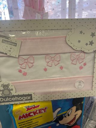 Conjunto de sábanas para cuna en color rosa, con un tierno diseño de conejitos y nubes. - Incluye sábana bajera, sábana encimera y funda de almohada. - Tejido suave y agradable al tacto. - Estampado de topitos y detalles bordados. - Composición: 100% algodón.