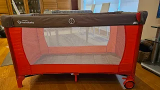 Cuna de viaje de la marca Asalvo, ideal para transportar y usar en diferentes lugares. Su diseño es práctico y funcional. - Color rojo y marrón. - Laterales de malla transpirable. - Ruedas para facilitar el desplazamiento.
